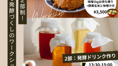 イベント 先着定員制!2部制:失敗しない味噌作り&発酵ドリンクワークショップ-酵素玄米と味噌汁付き- 1部:味噌作り 10:30-12:30 ― 腸から整える、やさしい手しごと時間 ― 「せっかく仕込んだ味噌がカビてしまった…」 「味噌作りに興味はあるけど、管理が難しそう」 そんな Read more... 2026.03.02 イベント